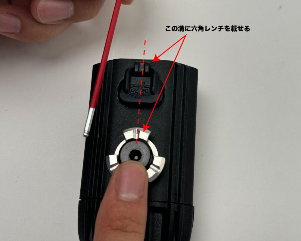 充電キャップの中心に溝が切られており、このように1.5mmの六角レンチをのせて合わせると、