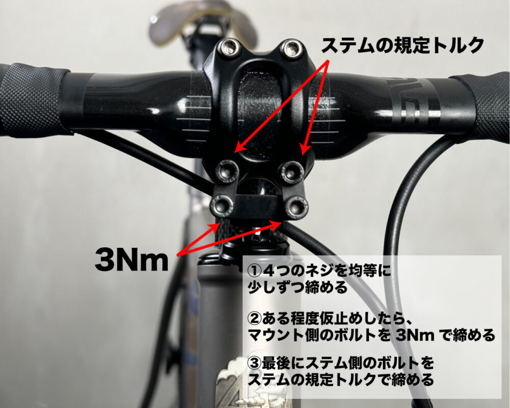 この時、ステム側のボルトとFLEXI MOUNT側のボルトを全体的に徐々に締めていくことで、