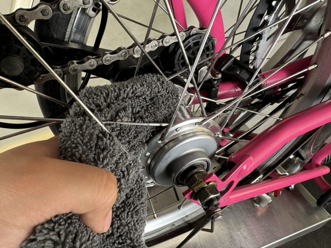 ハブは少し拭き取りにくいですが、指を使ってスポークの間からアプローチしましょう。