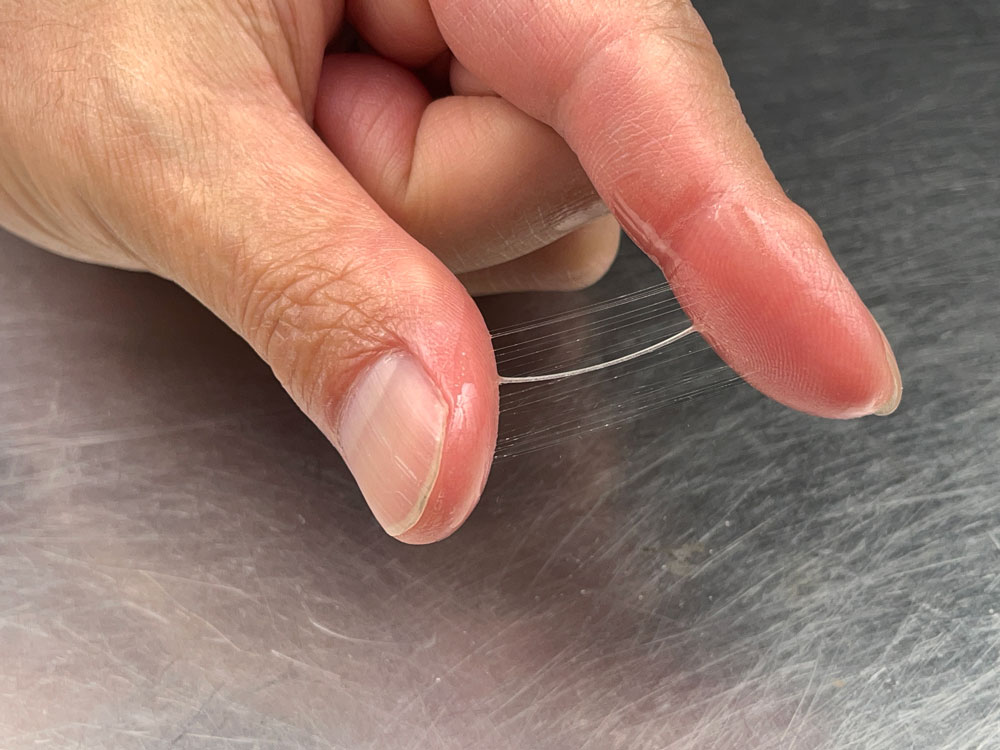 チタンスプレーには粘弾性オイル成分が含まれており、指につけて離すと糸を引くほど強い「粘り気」があります。