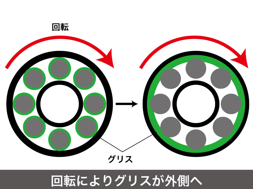 そして、ベアリング内のグリスはゆがみや遠心力によりベアリングの外へ外へと移動(剥離)しようとする力が働きます。
