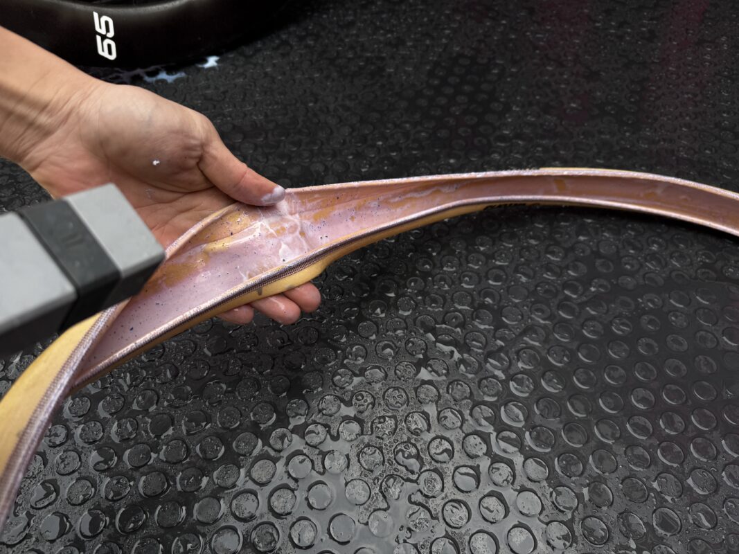 今まで使用していたシーラント「Muc-Off NOPUNCTURE HASSLE TUBELESS」は完全に固まっていなければ水溶性で水で洗い流し可能です。