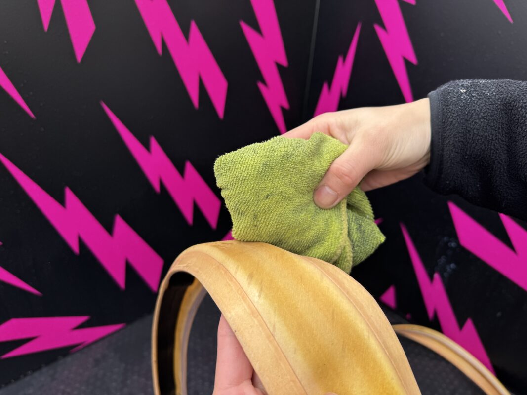 一度ウエスで水分を拭き取り、ホイールにタイヤを取り付けます。