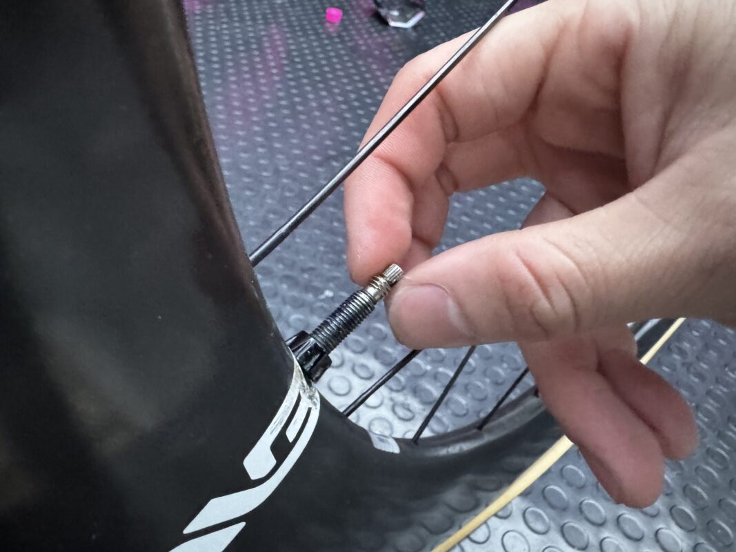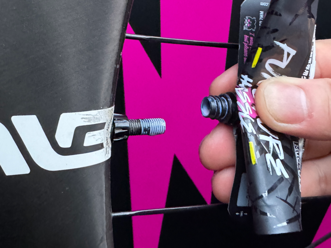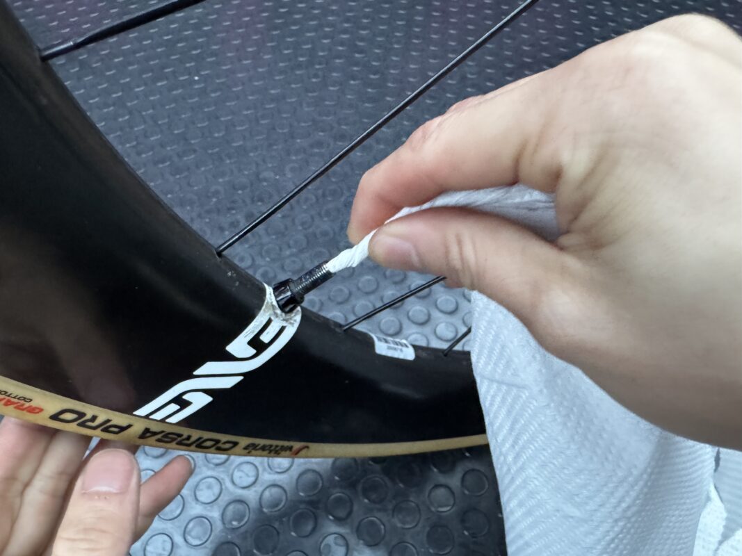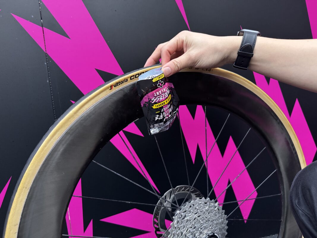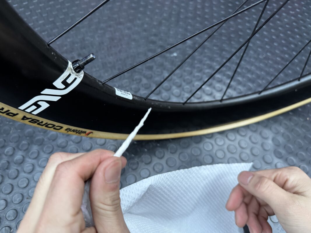 Muc-Offのシーラントはビードを上げて、バルブから入れていきます。