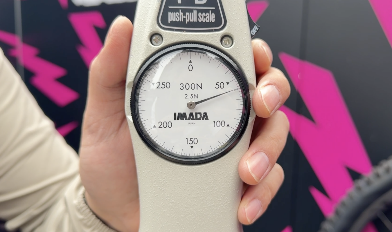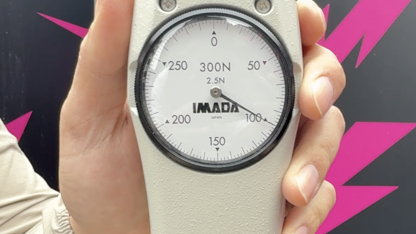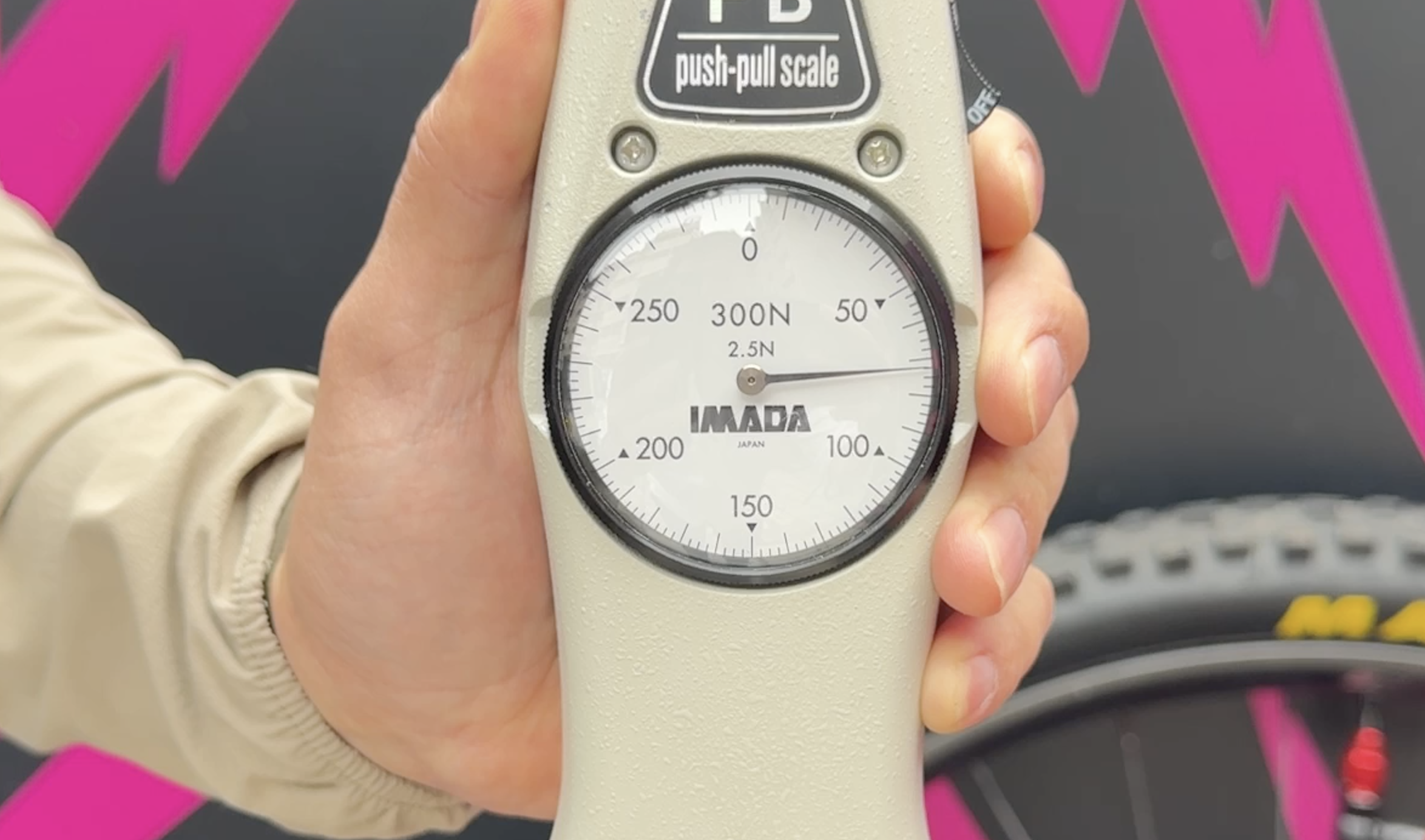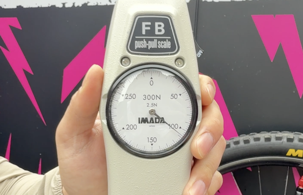 バルブコアがついている方は72.5N(ニュートン)に対し、BIG BORE VALVEは60Nの力で押すことができました。