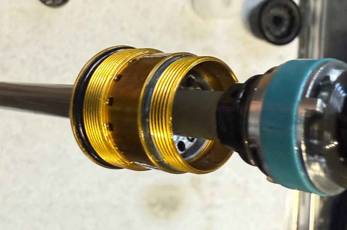基本的にサスペンションのダンパーはピストンに開いた穴(オイルの通り道)をオイルが行き来するの(各社工夫を凝らしたシステムが存在します)ですが、オーリンズはそれに加えて内側のシリンダーの上下に穴が空いていて、そこからも出入りするようになっています。