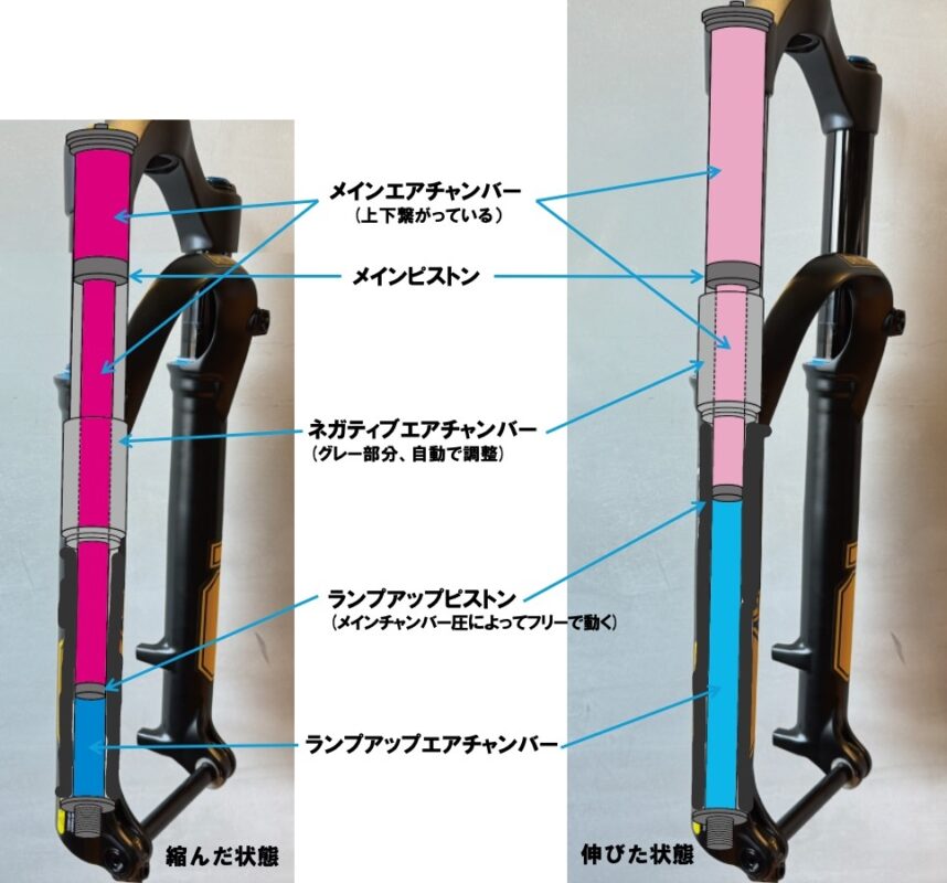 エアスプリングを搭載したフロントフォークは、メインエアチャンバー、ネガティブエアチャンバー、ランプアップエアチャンバーの3つのエアチャンバーからなります。