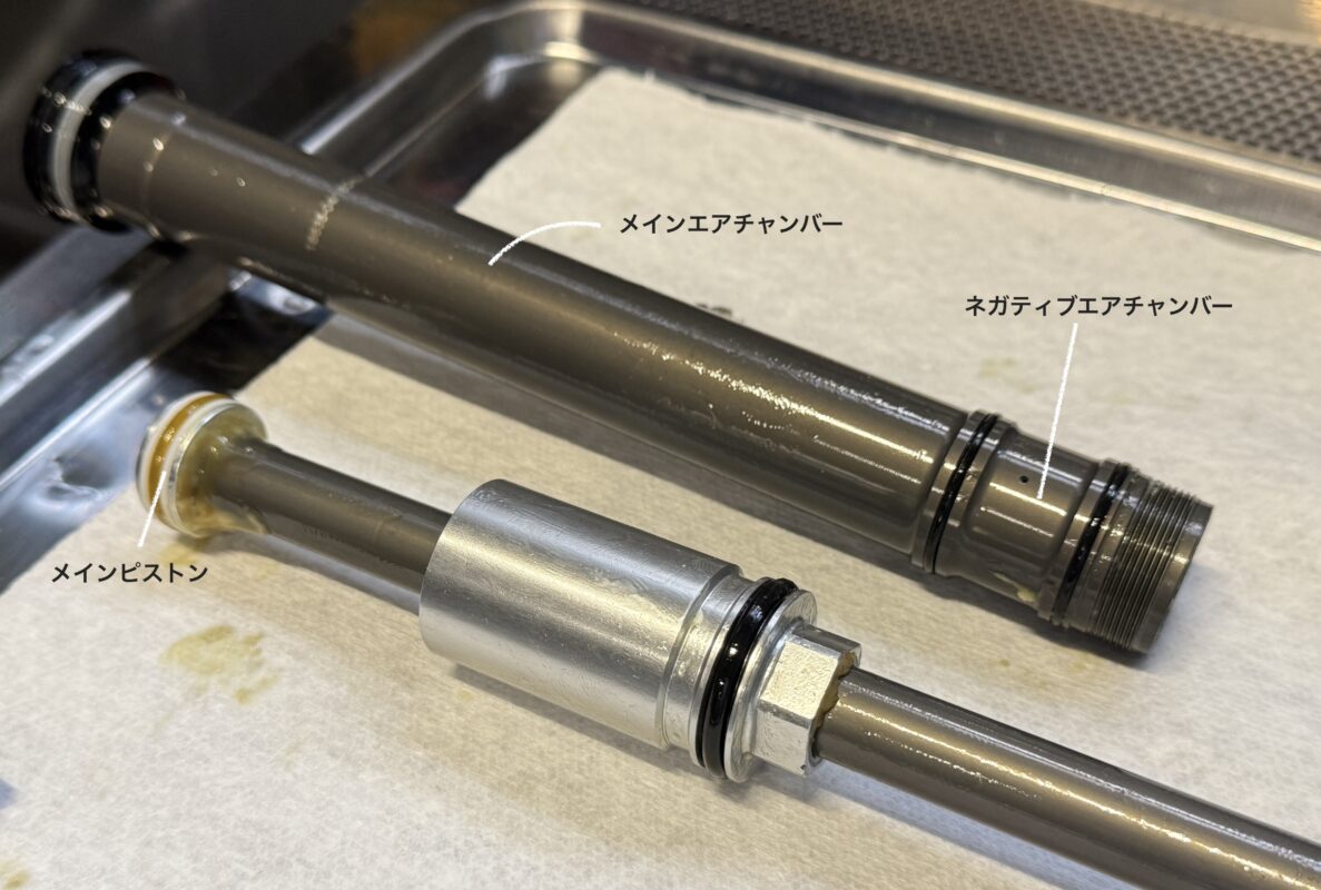 ネガティブエアチェンバーは、エア圧により、シリンダ内壁に押し付けられるシールのフリクションを打ち消すために設けられた機構であり、サスペンションが縮む方向に動き始めるときに、メインエアチャンバーの反対側から、空気の圧力で加勢して、フロントフォークがスムーズに動き始めるようにする役割。