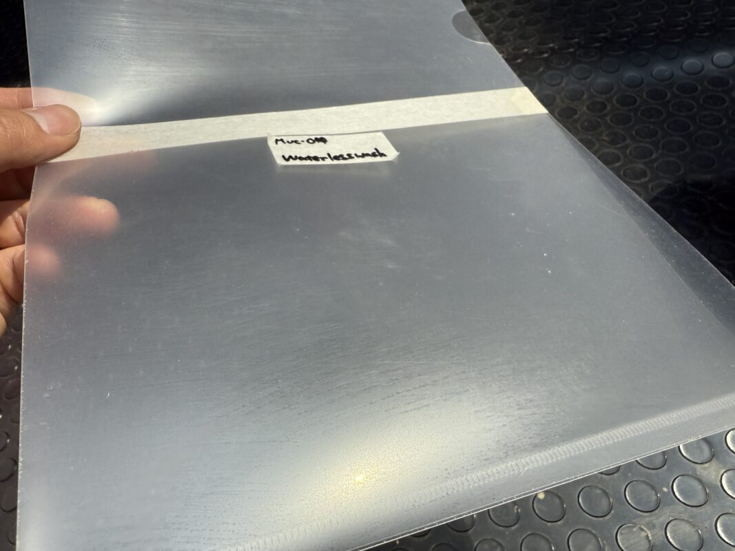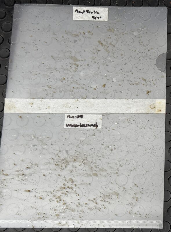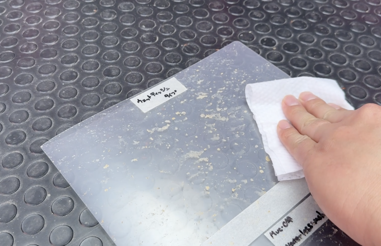 クリアファイルの上に砂埃を付着させ、ウェットティッシュで拭き上げた場合と、