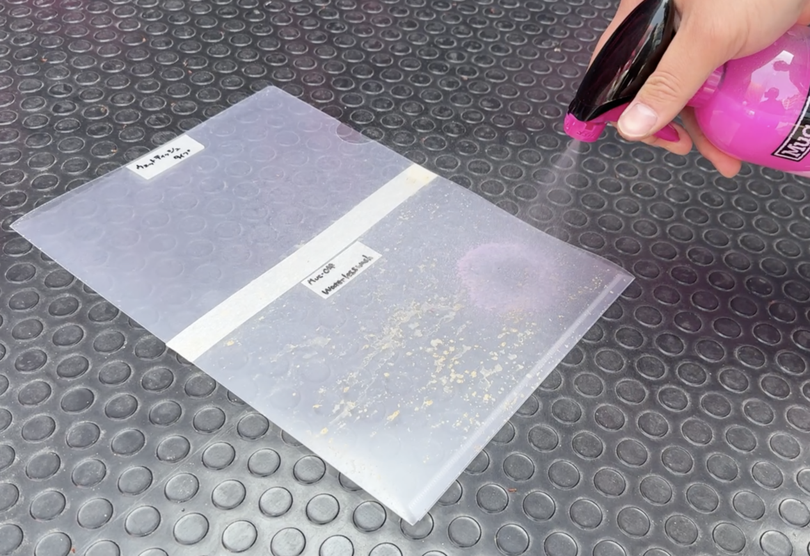 実際に砂埃が付着している面にウォーターレスウォッシュをスプレーすると、汚れをまとった白い粒が流れているのがよくわかります。