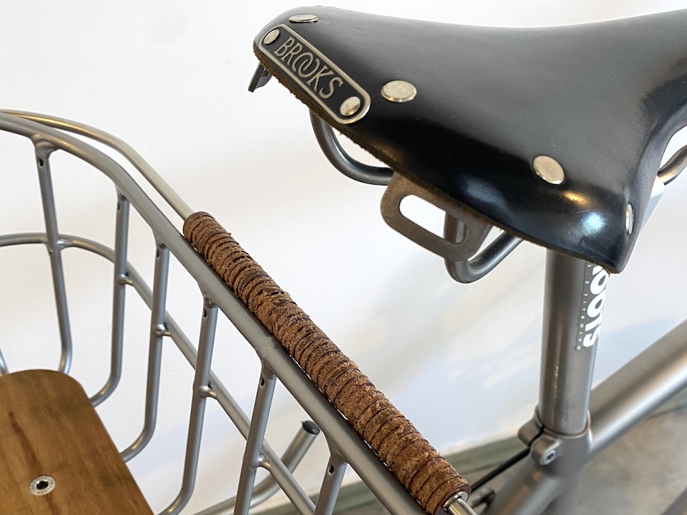 ハンドル部分には、生産時に出た余りの素材を再利用した、ブルックス製の本革グリップを採用しています。環境にも配慮された設計です。