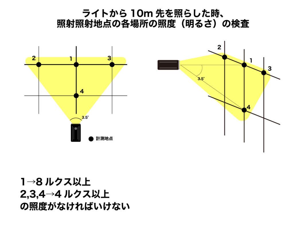 JIS規格のライトの規格(JIS D 9115)においてさまざまな規定があり、すべてはチェックできていませんが、その中でも最も重要な明るさ、色度について試験を行い、問題なくクリア
