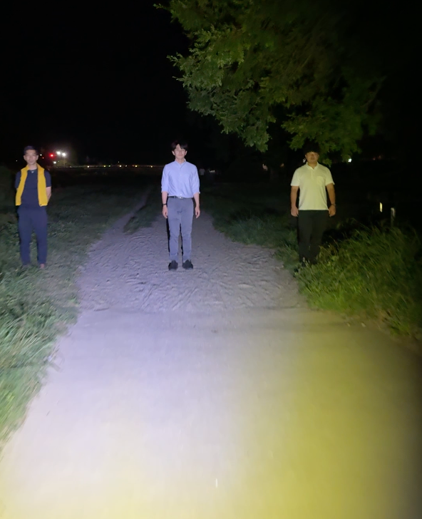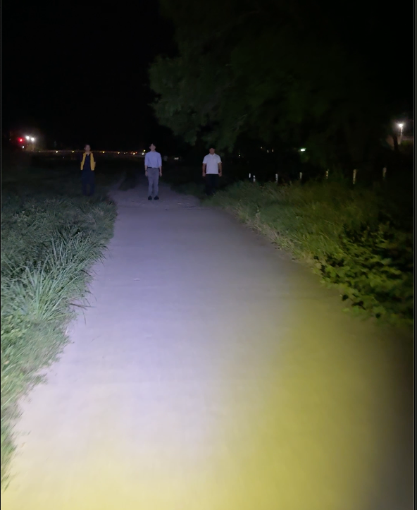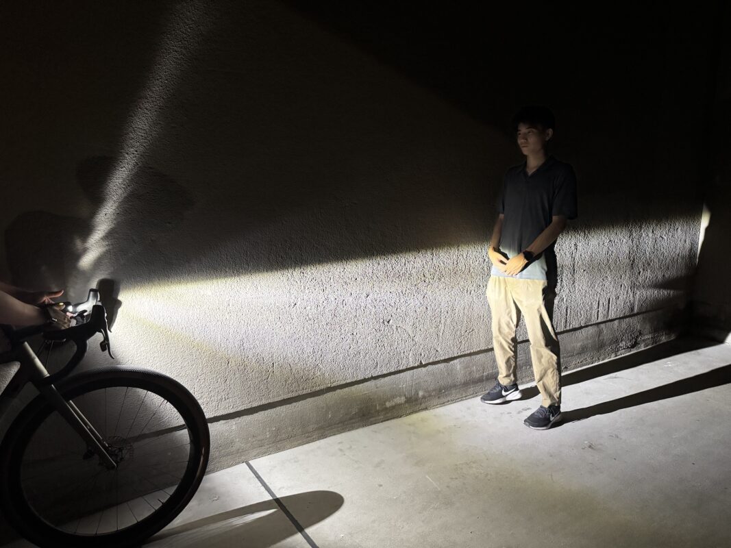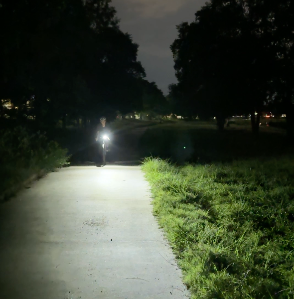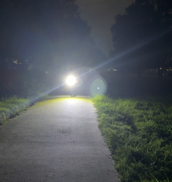 この距離では通常ライトは歩行者よりも上の木まで明るく照らしています。