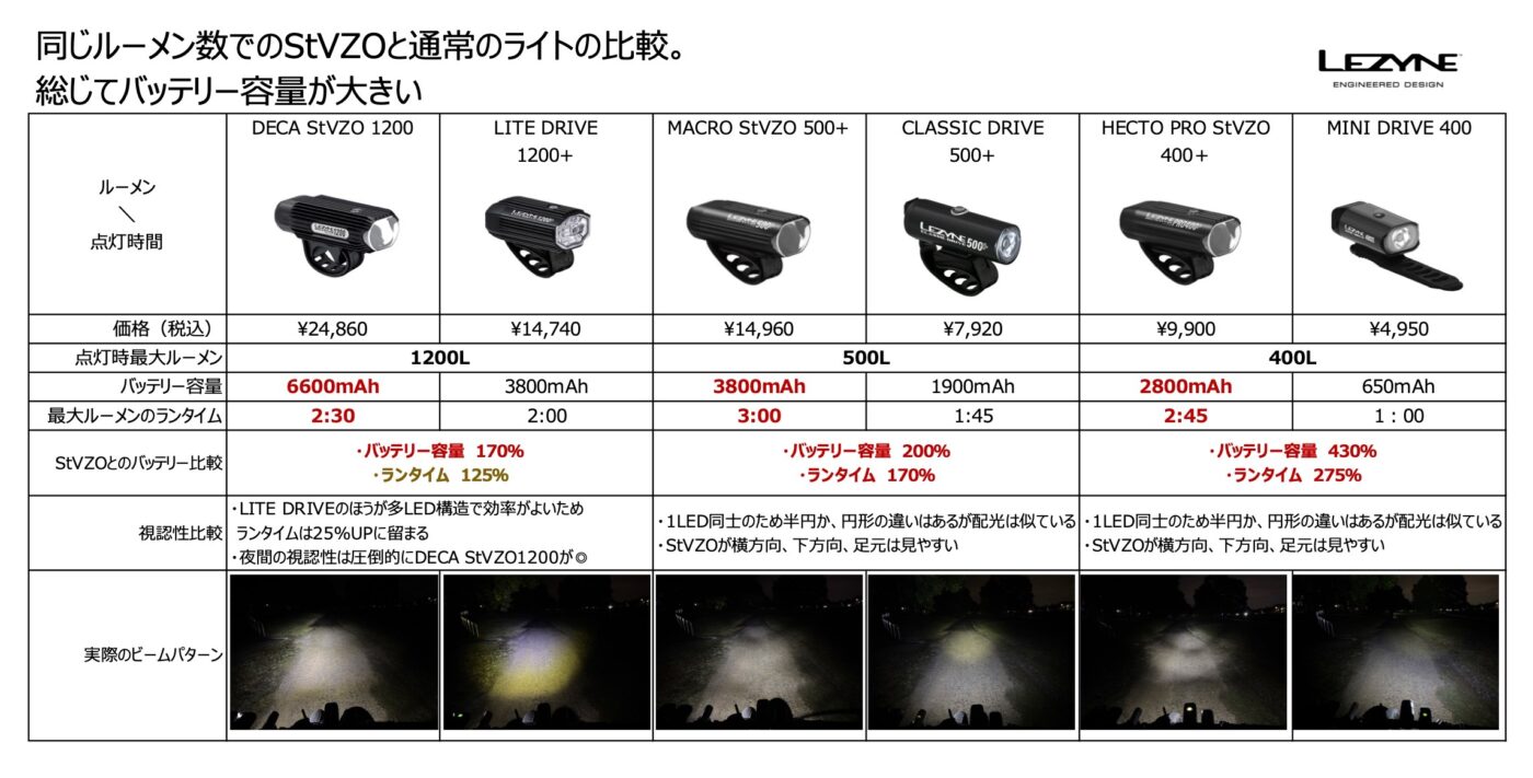 同じルーメン数のライトとランタイム(点灯時間)の比較をしたとき、