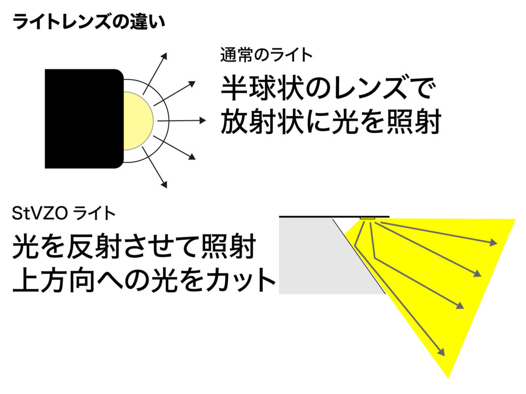 StVZOのライトは、上方向に光が向かないように光源の位置、照射角を調整しています。