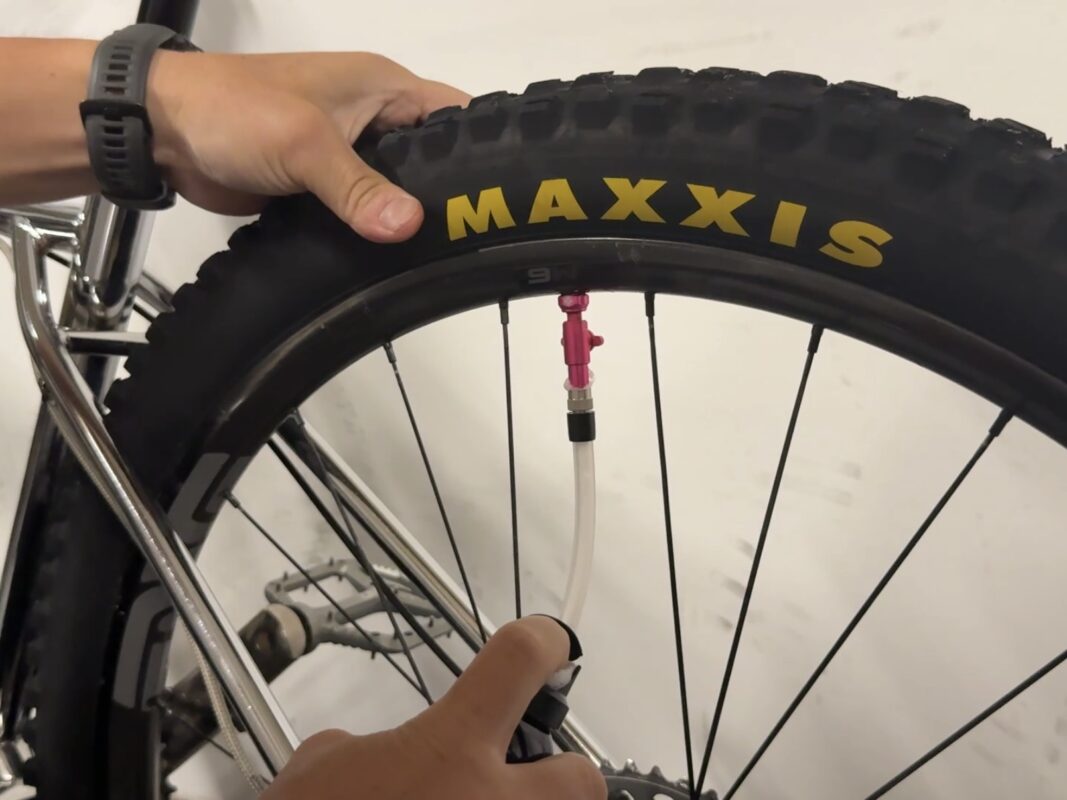 チューブレスの場合、プラグを指すorチューブを入れる→空気を入れる(ハンドポンプorCO2)
