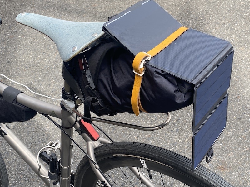 キャリアがあれば、ばっちりですが、サドルバッグにくくりつけてという作戦もありです。
