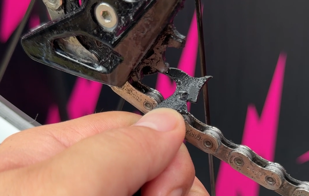 プーリーに添えながらゆっくりチェーンを回していくと、こびりついた汚れを取り除くことができます。