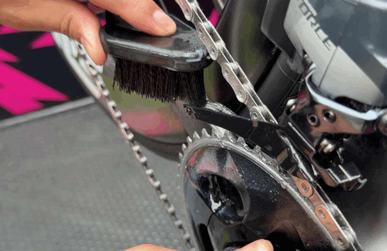 チェーンの内プレートにもブラシが届くように、少し強めに前後に動かします。