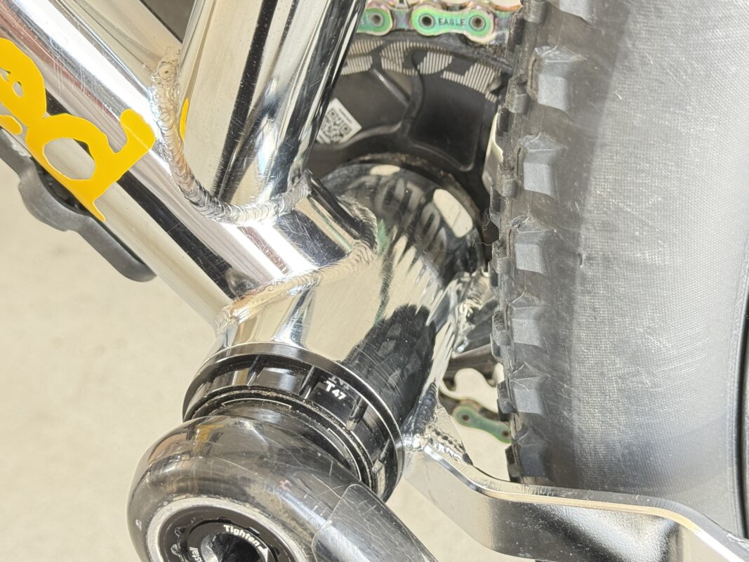 シェル径の大きいT47にする理由は、フレームへの負担を考え、溶接面のアールを大きくとるため。そして、ペダリング時の剛性感とフレックス感の両立を図っています。