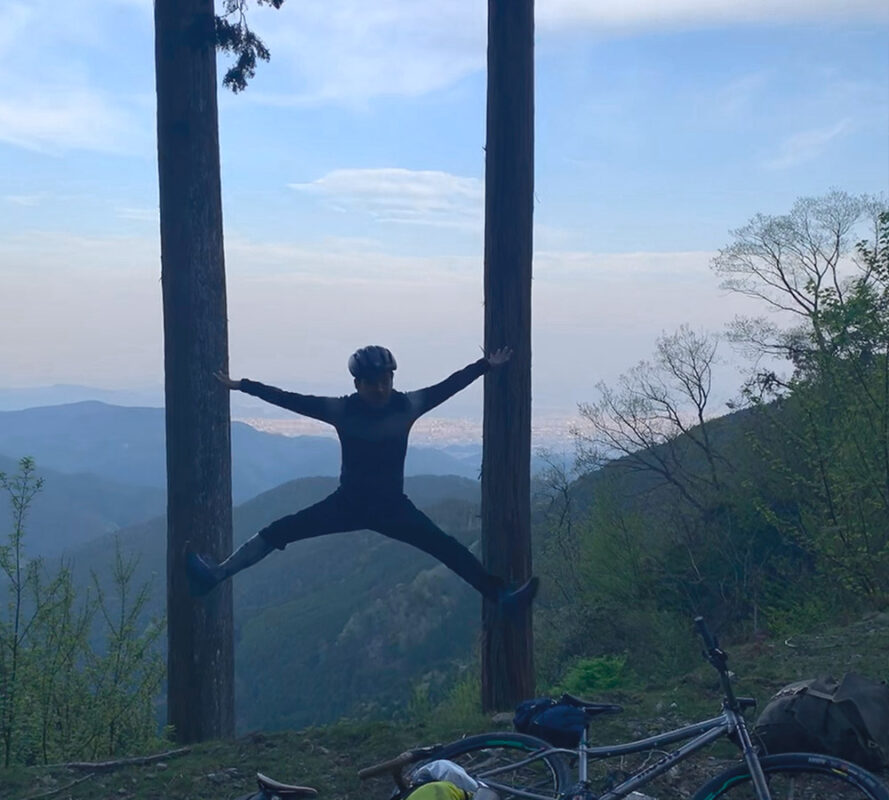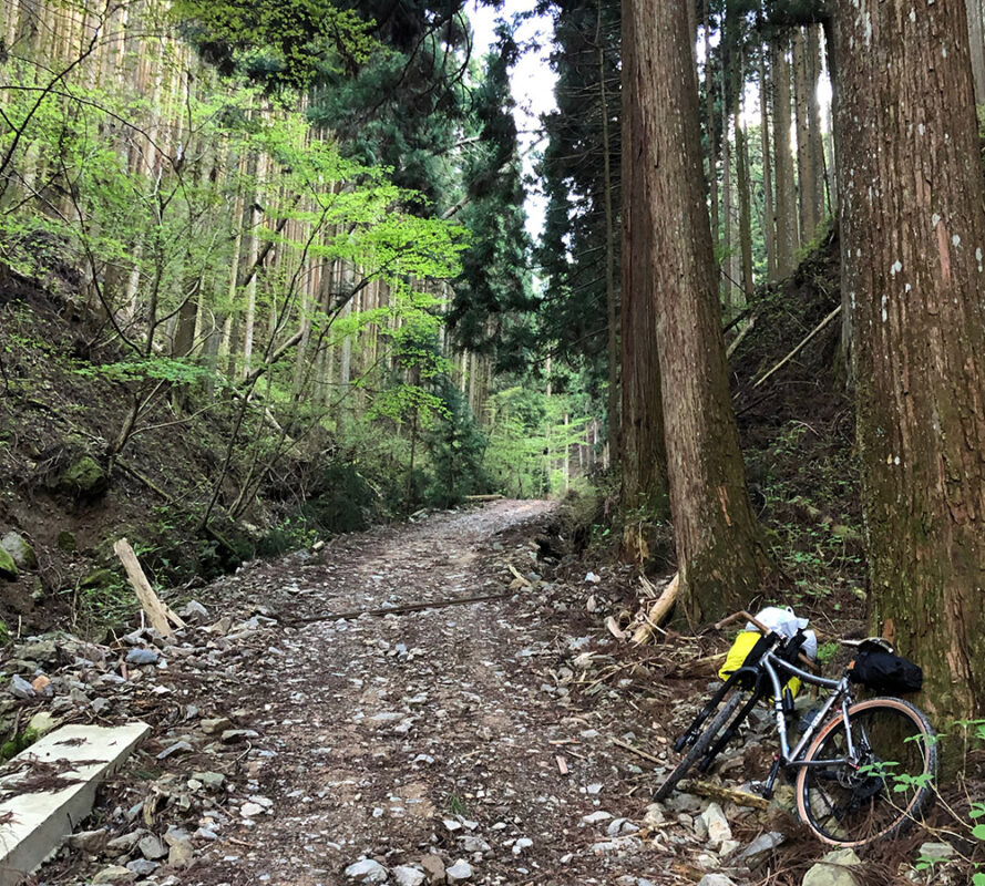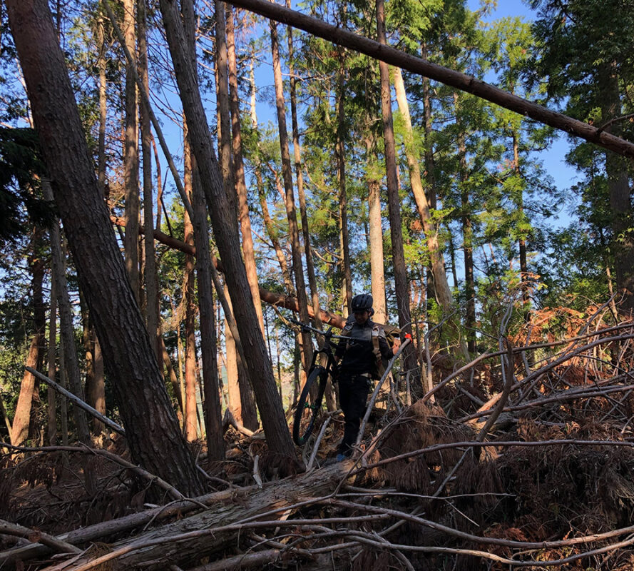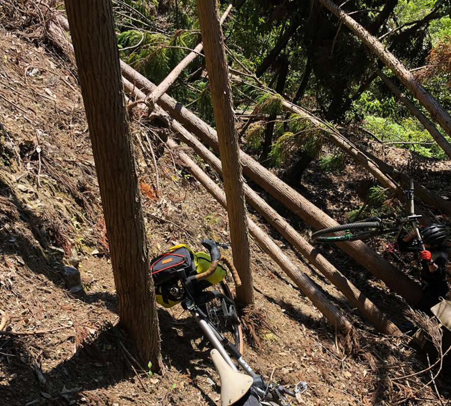 最高に気持ちの良いダートのダブルトラックを抜けると、峠に差し掛かりここからシングルトラックが始まり極上のトレイルライド…のはずが、