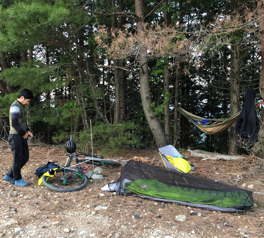そして寝床を確保。軽量コンパクトを目指して、ハンモックとビビィを選択したものの、峠は思ったより風が強く、まだ冷たい。