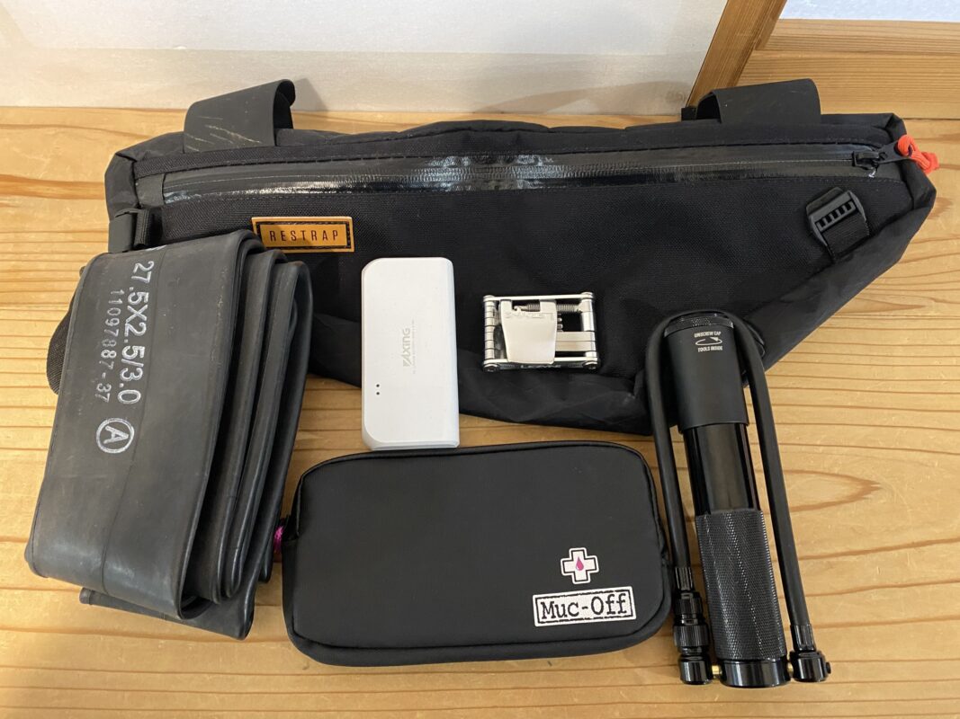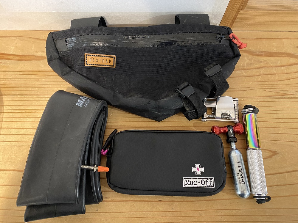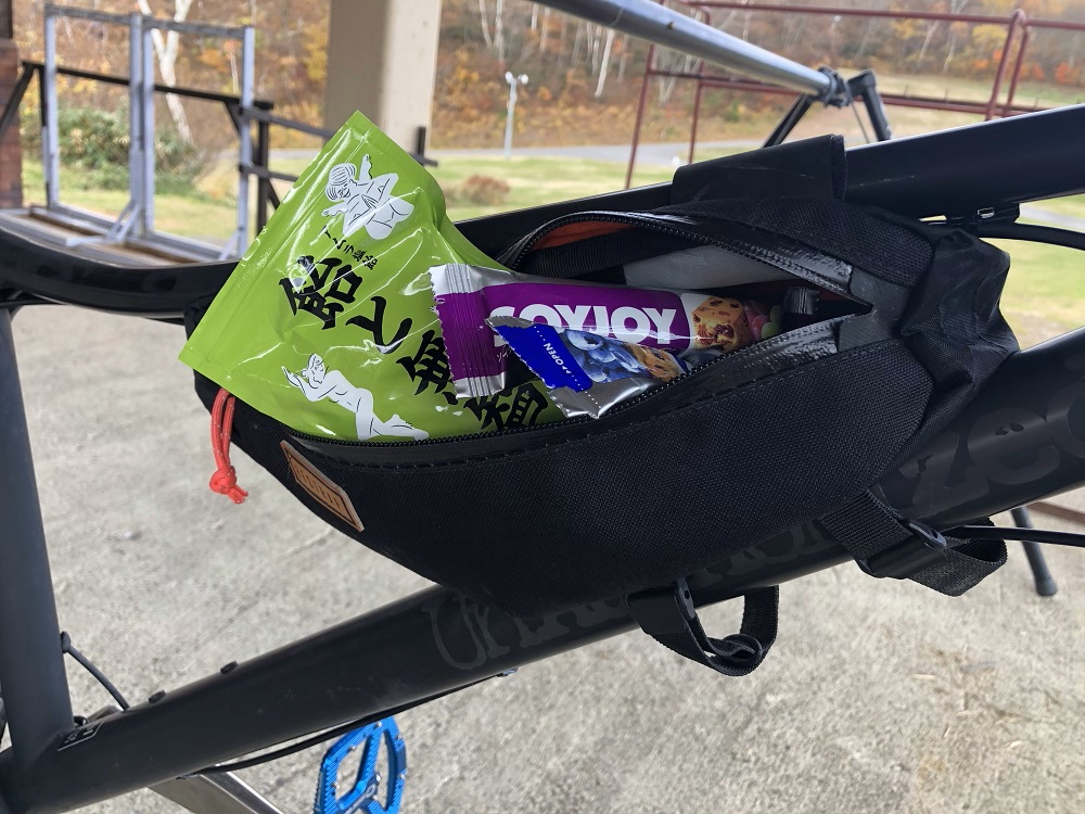 今回のグラベルライドだと、補給食スペースを手元に、携帯工具やウィンドブレーカーなどをフレームに収納するのが一番快適のように感じました。