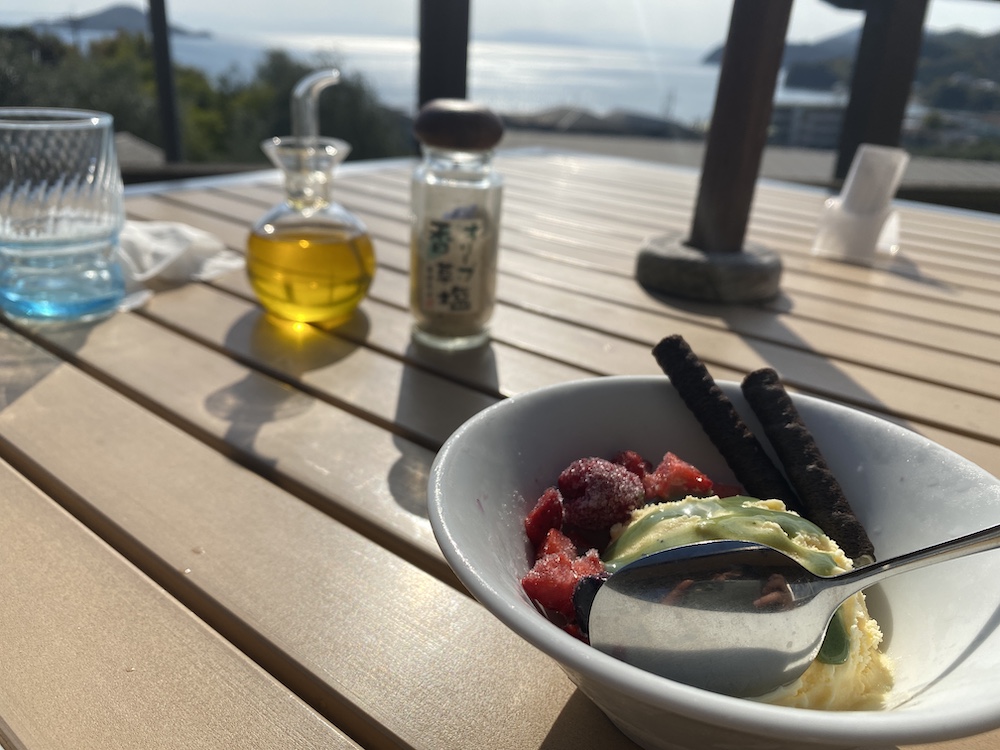 デザートのアイスクリームにもオリーブオイルをかけ、口の中がオリーブで包まれながらフェリー乗り場へ向かいました。