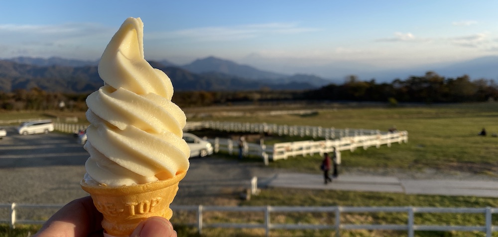 帰りの仕上げは、清泉寮のソフトクリーム(寒くてブルブル震えながら)と富士山。