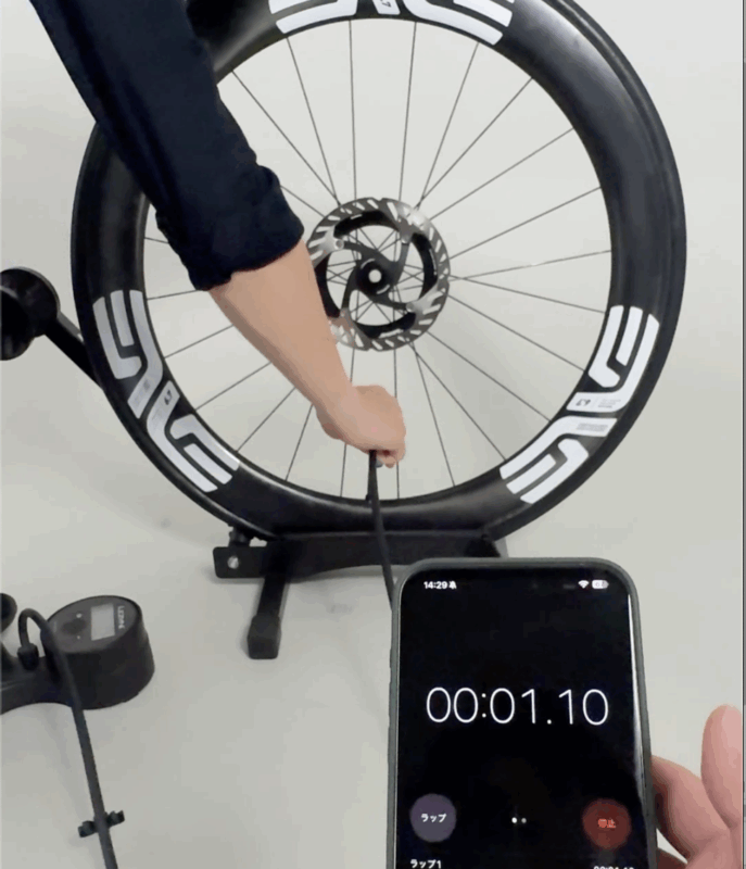 今回使用するENVE SES4.5の適正空気圧60psi(4.13bar)まで空気を入れたときのタイムを比較します。