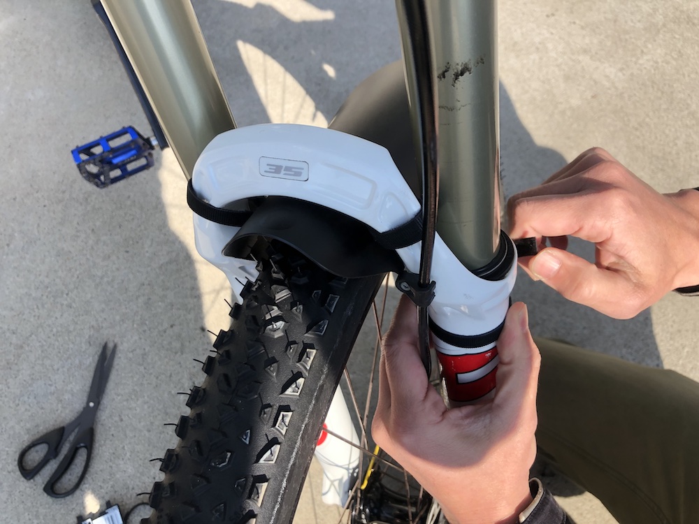 MUGGUARDはベルクロでもよいですが、よりカッチリ取り付けたいなら、タイラップどめの方がずれずに固定できます。