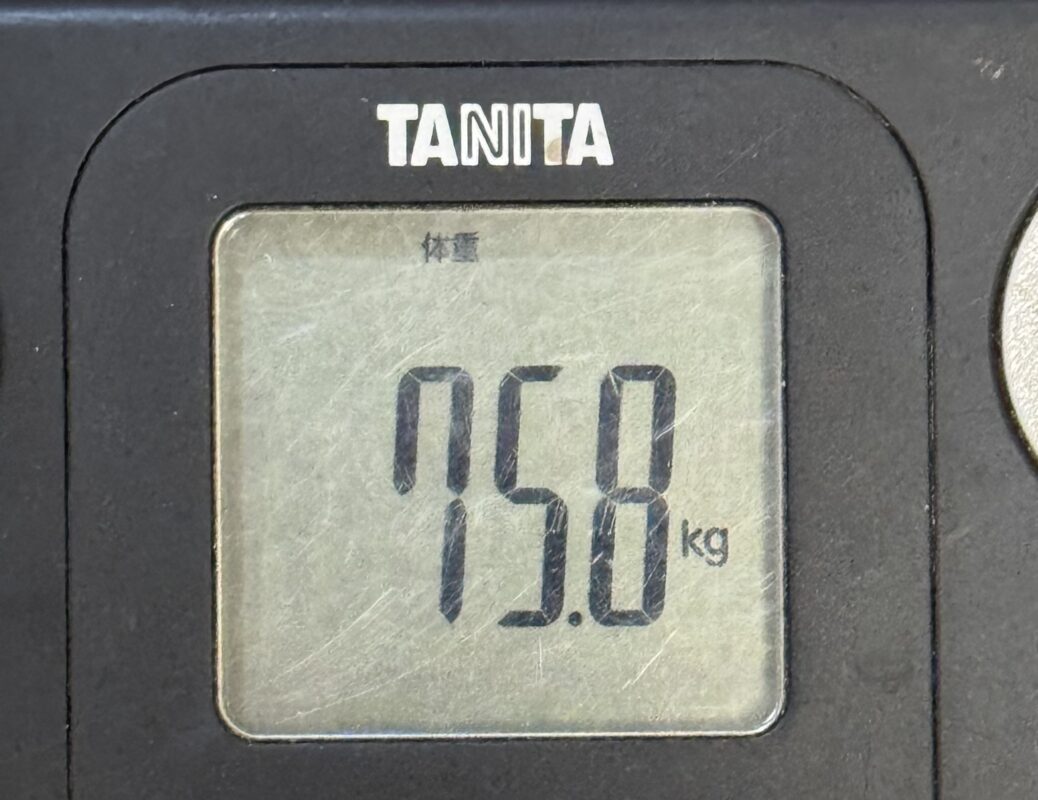 トレーニングと食事管理で順調に下がり、レースウィークの金曜日には75.8kg。ダイエット開始から10日ほどで約3kg減。良い感じ!