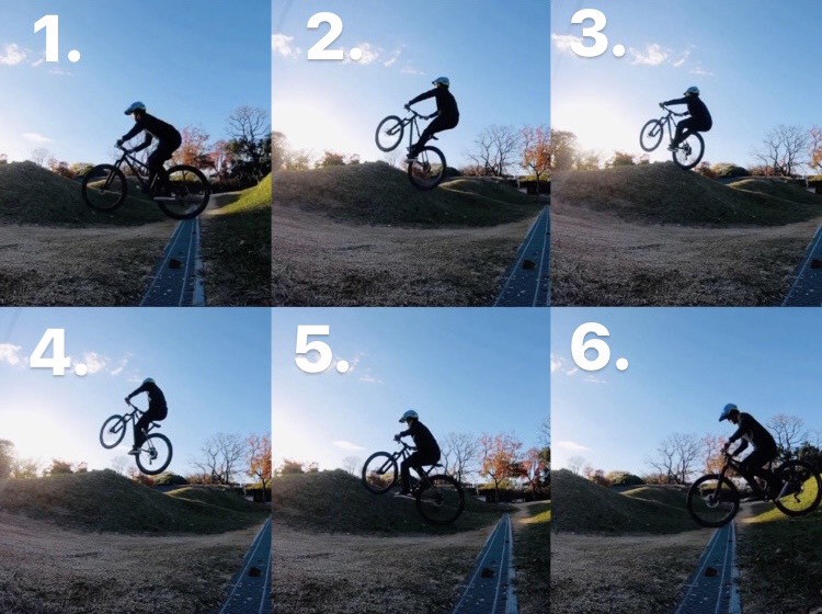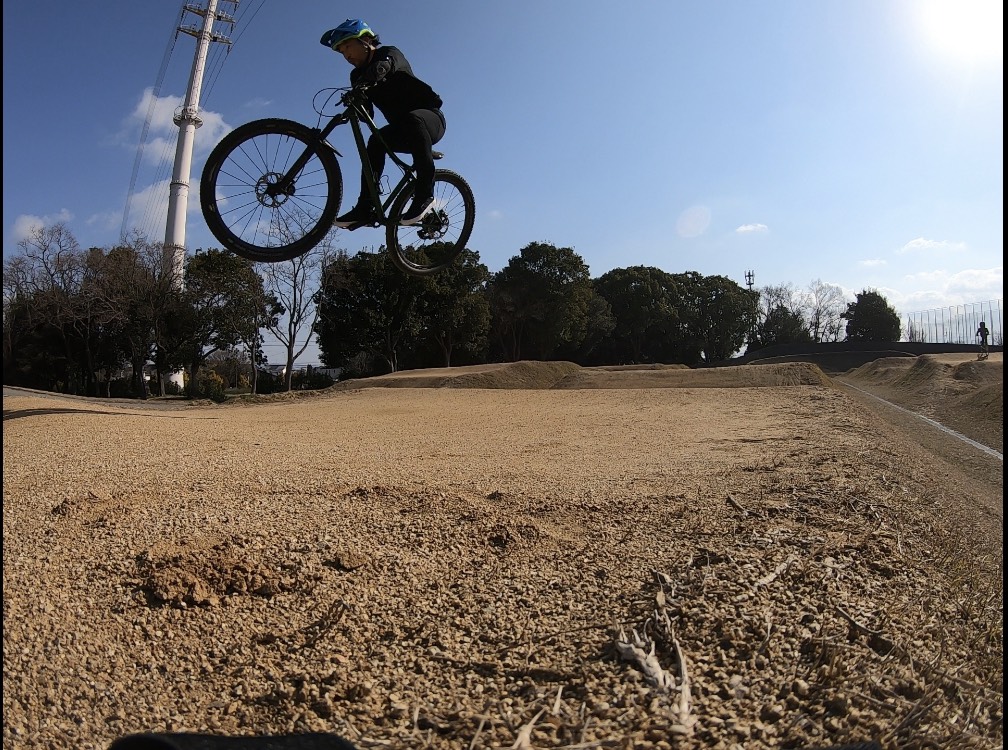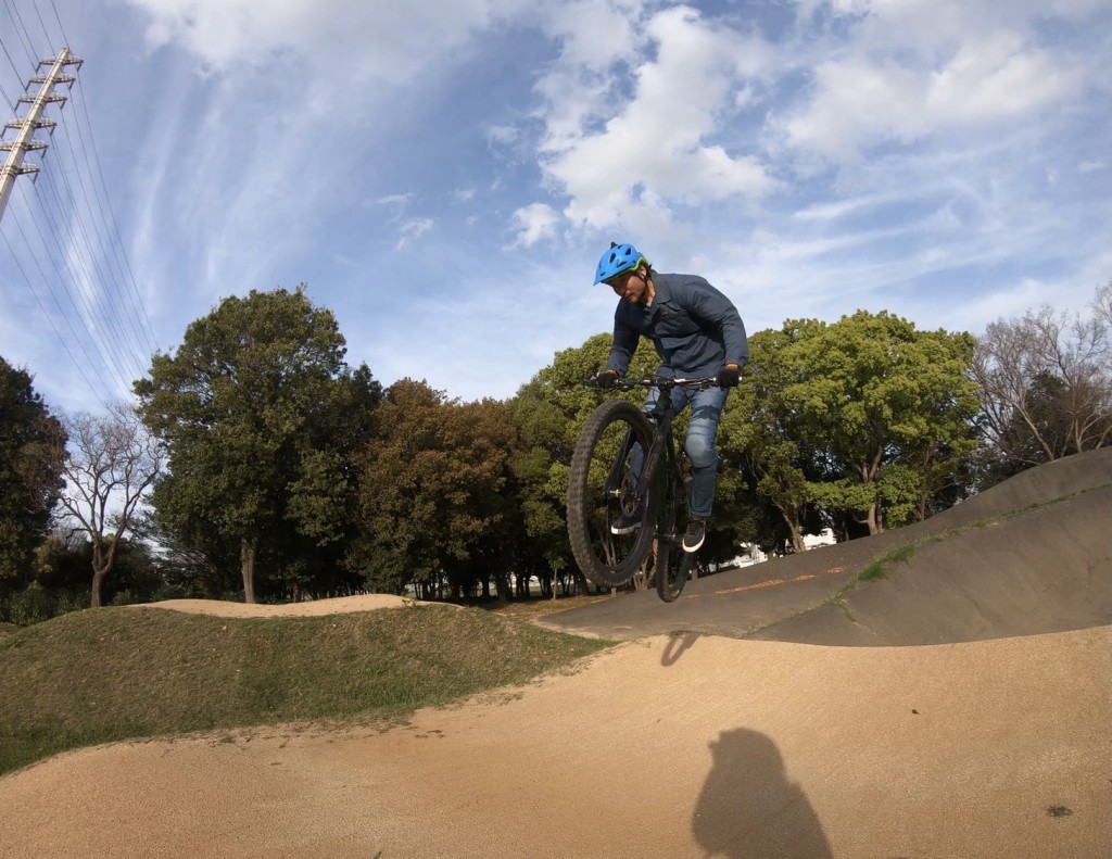初めて29インチのマウンテンバイクでジャンプしたが大柄な車体に乗って飛ぶとBMXの時とは景色が違い迫力があり面白い。BMXや26インチのダートジャンプバイクのように軽やかではないが、逆に安定感があるので失敗しても転倒に繋がることは減りそうだ。