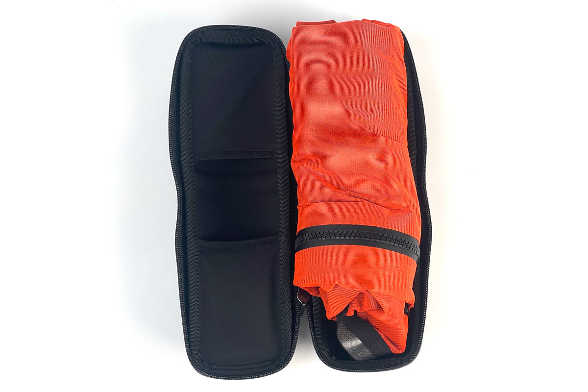 ファスナーで大きく開き、片側はウェアスペース、片側はポケットが2つあり、嵩張りがちなウィンドシェル、携帯ツール、ポンプなど綺麗に収納可能。