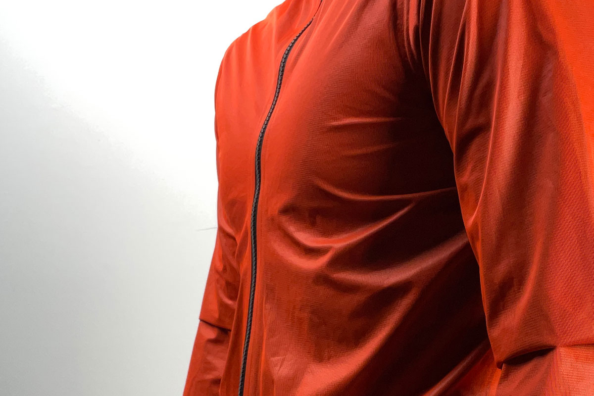 レインシェルながら、横方向にしっかりと伸縮性があり脱着しやすく、ライディング時にも体にしっかりとフィット。バタつかずエアロ効果を高めます。