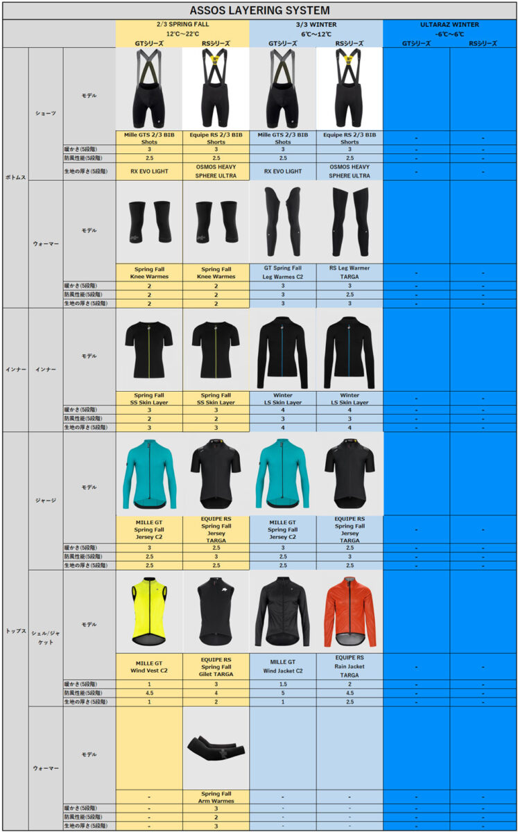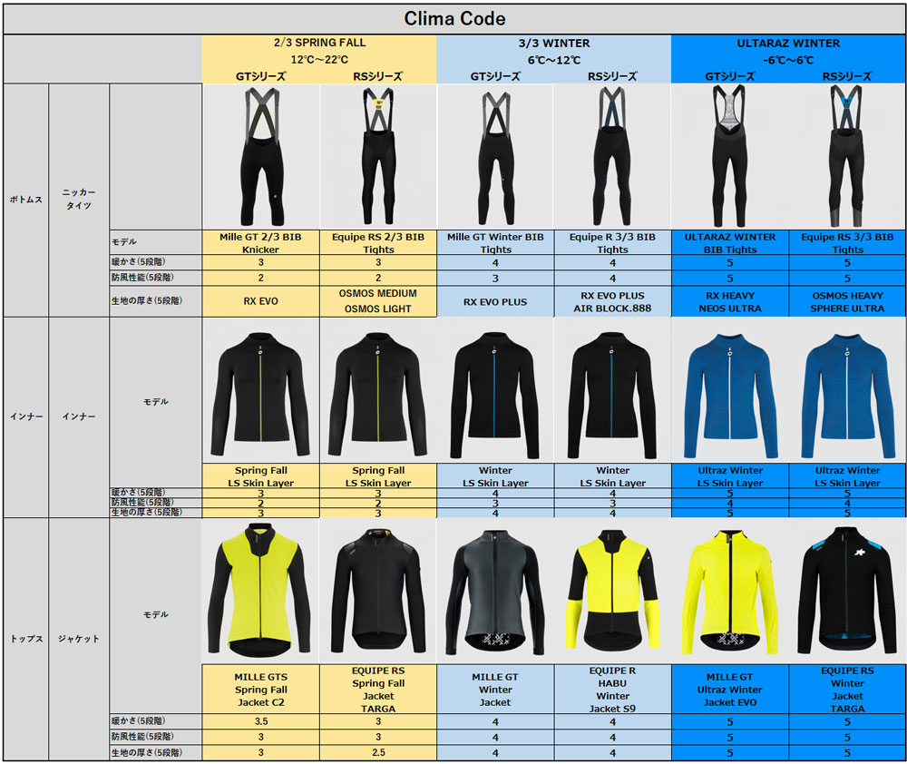 ASSOSのウェアはクライムレンジと呼ばれる4つの気温に合わせたプロダクツが存在します。