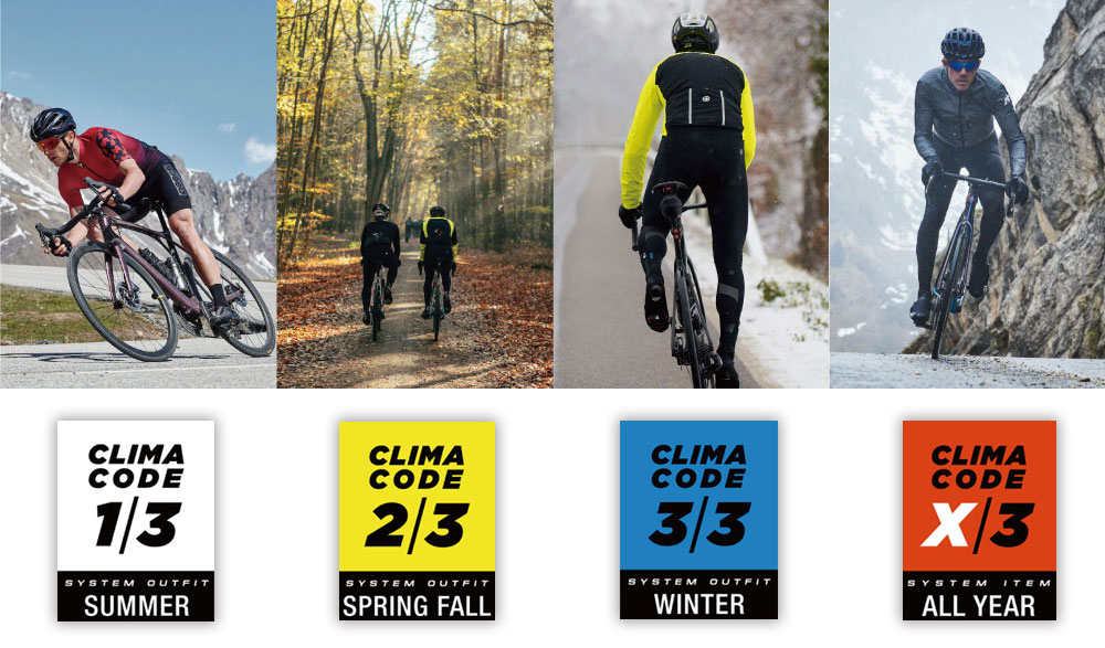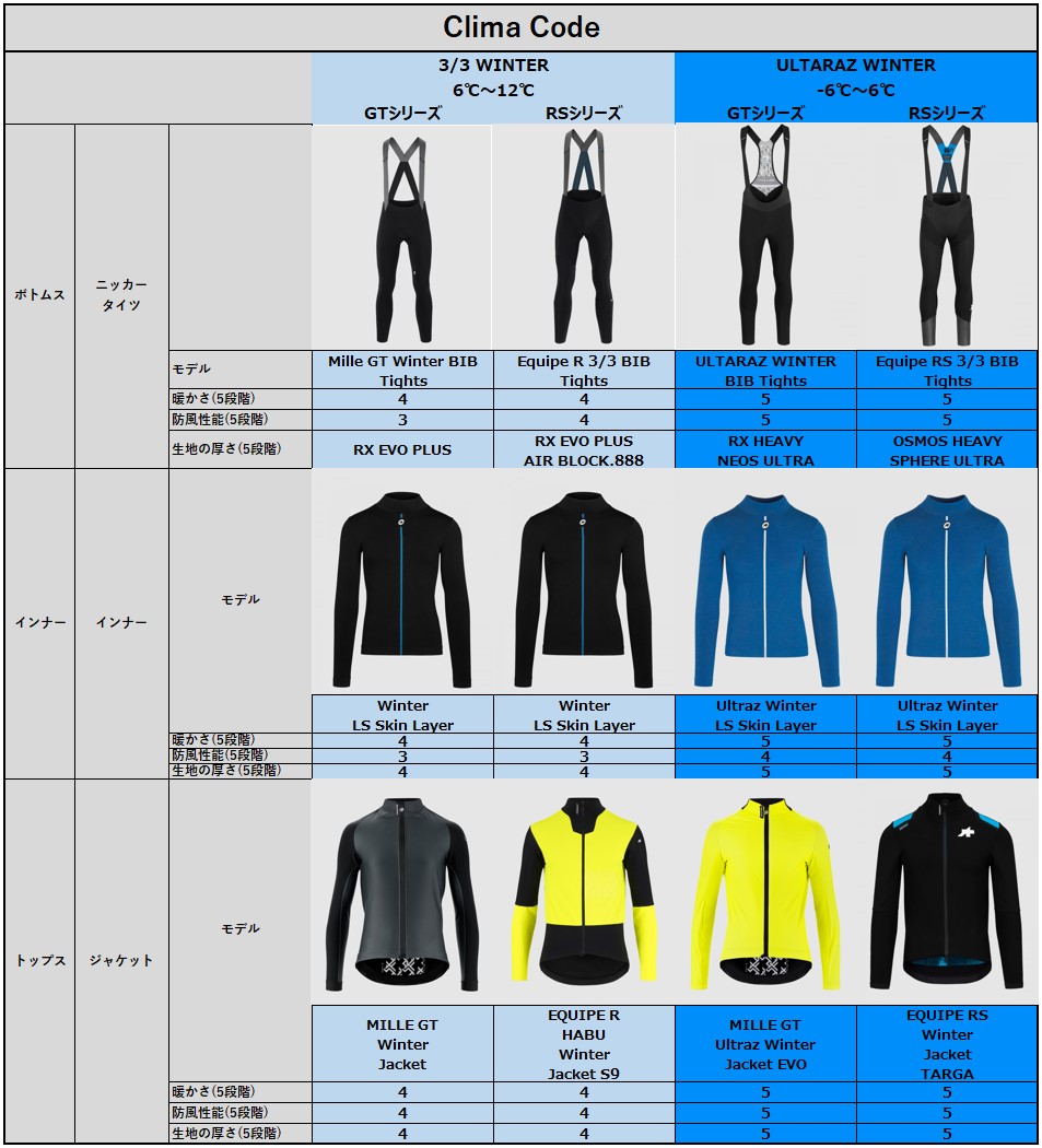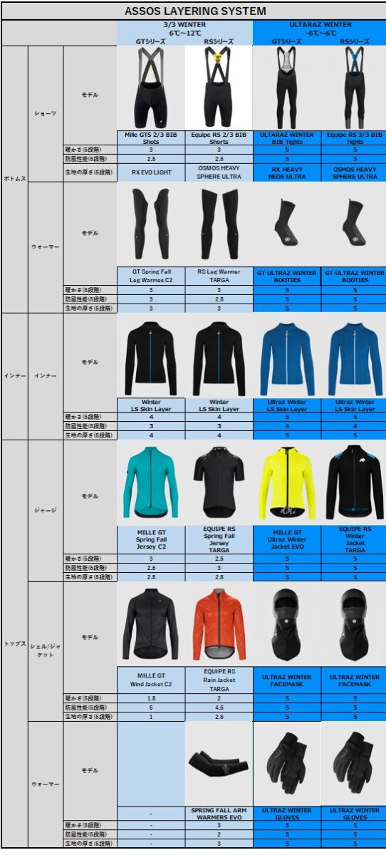 ASSOSのウェアはクライムレンジと呼ばれる4つの気温に合わせたプロダクツが存在します。