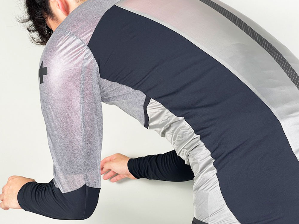 脇周り腕には透湿性を高める生地が使用され、上がり過ぎた熱は外へ逃がします。