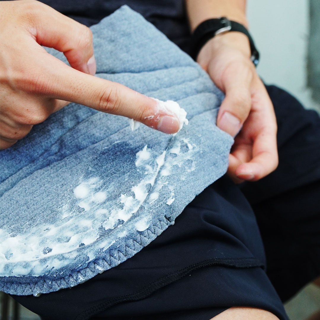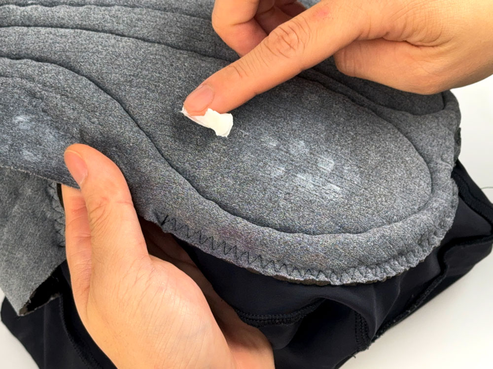 まず初めにASSOSが目安としているインサートの色がうっすら白く(シャモアクリームの色)になるぐらいの量です。