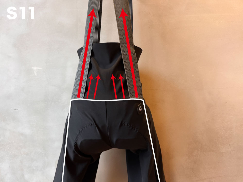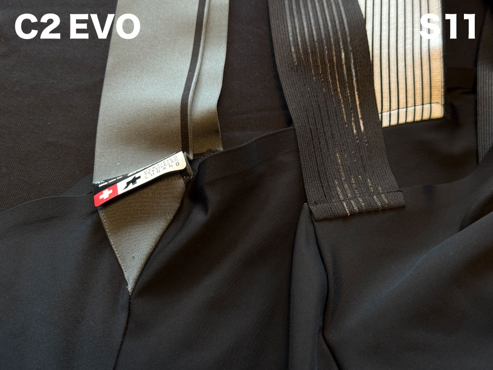 C2 EVOでは後ろ側と前側の2種類の生地でビブストラップが構成されていましたが、S11では後ろ側と前側に2種類計3種類の生地が使用されています。