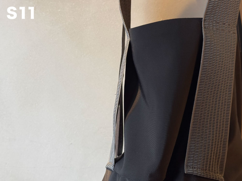 またストラップの固定方法も変化。C2 EVOではストラップの端を三角形にショーツ上部の少し下に固定。さらにウエストにスタビライザーを入れることでショーツを引き上げていましたがS11では、ショーツ上部と並行に固定し、裏側から斜めのスタビライザーでサポートすることでショーツを引き上げます。