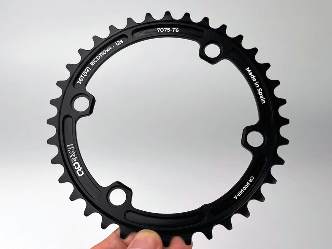 ディンプル加工が施された特徴的なエアロチェーンリングが目を引くチェーンリング。