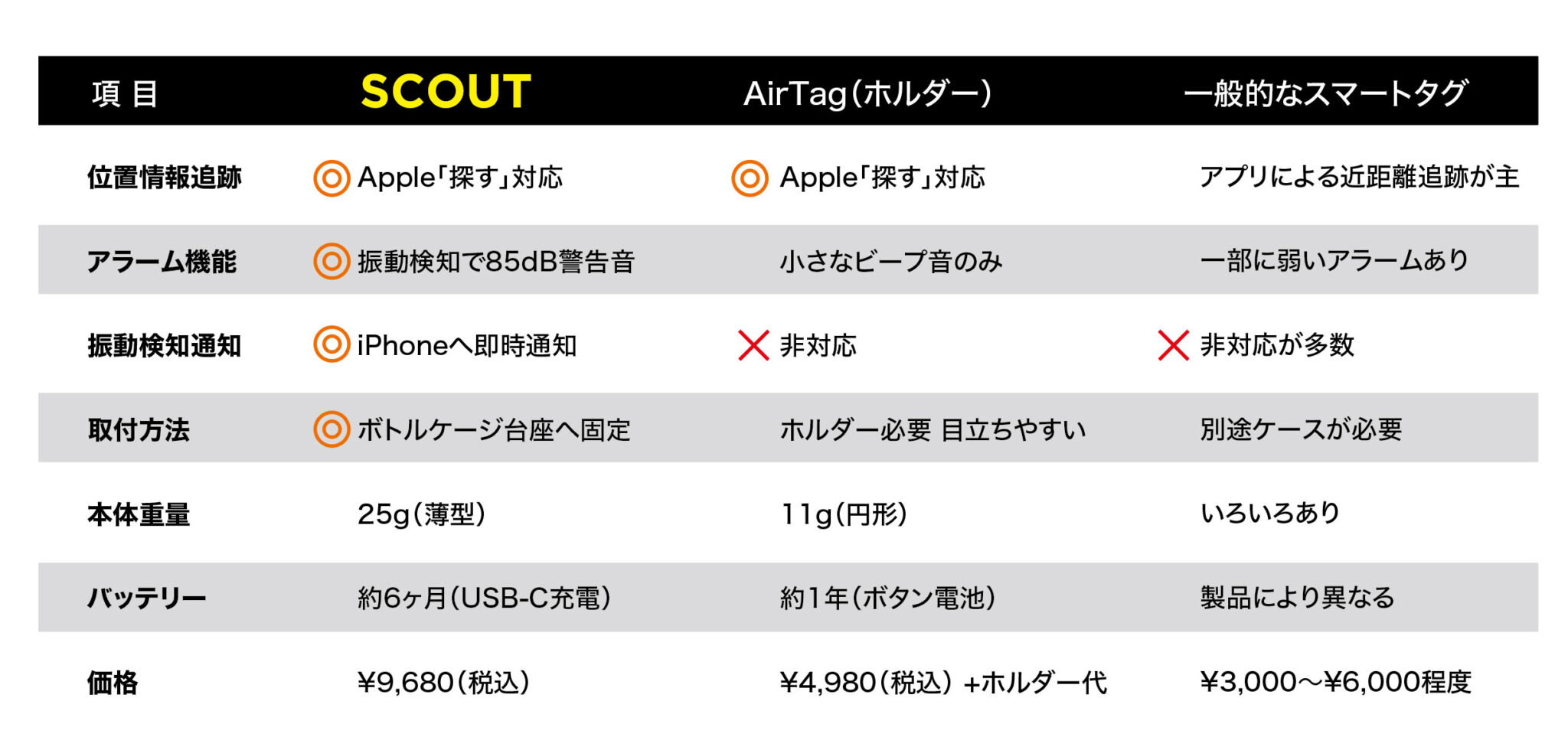 SCOUTはAppleの「探す」ネットワークを利用している点ではエアタグと同じですが、エアタグにはアラーム機能がありません。つまり「盗まれた後の追跡」には使えても、「盗まれそうな瞬間の抑止」には向きません。