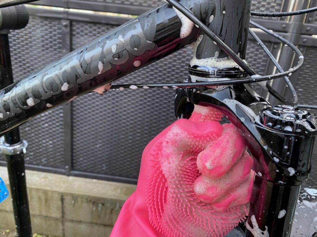 ステー裏やハブ周りなどの細かい部分も、手の感覚で洗えます。
