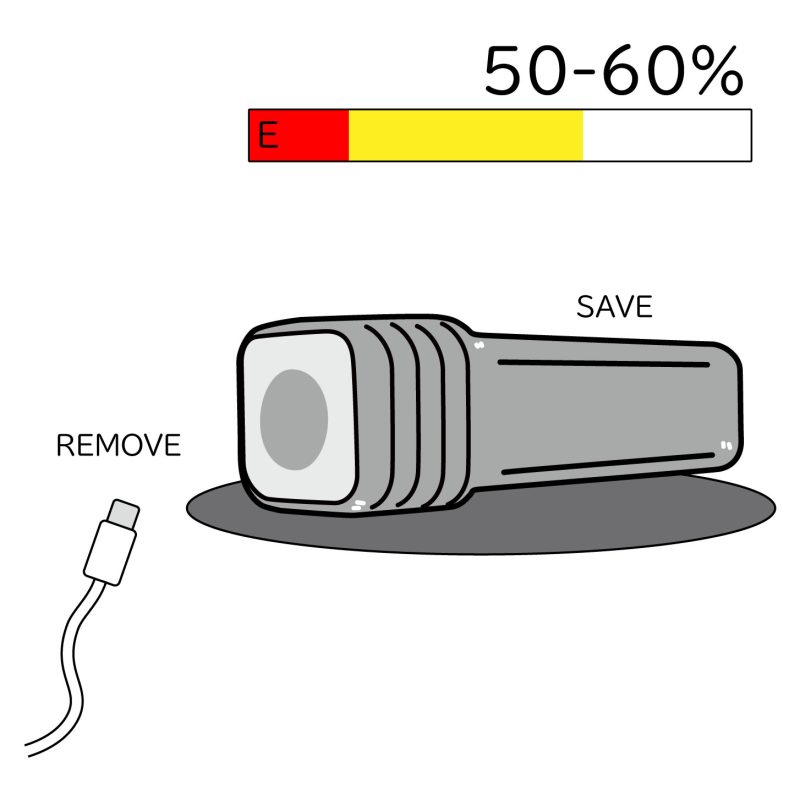 9. 長期保管は涼しい場所・50〜60%の残量で