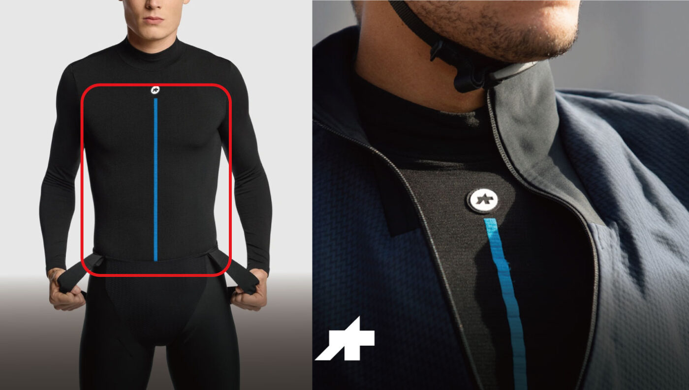 自転車の特殊な環境に合わせ開発された自転車用ベースレイヤーは、風の当たる前がは保温性を高く、ウェアが密着する後ろ側は通気性の高い構造になっており、さらに寒さを感じやすい首元は暖かさを保つため襟が高くなっています。