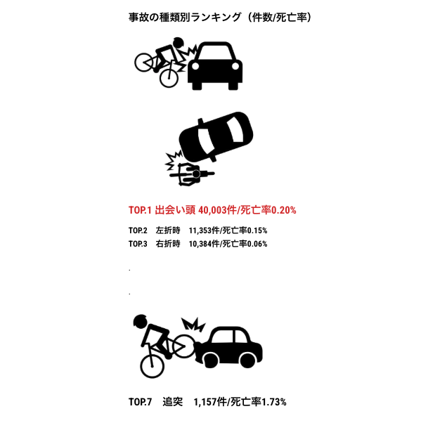 事故の件数は出会い頭が圧倒的に多いですが、死亡率は0.2%