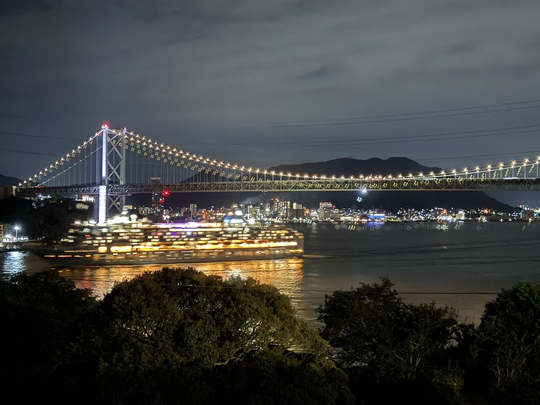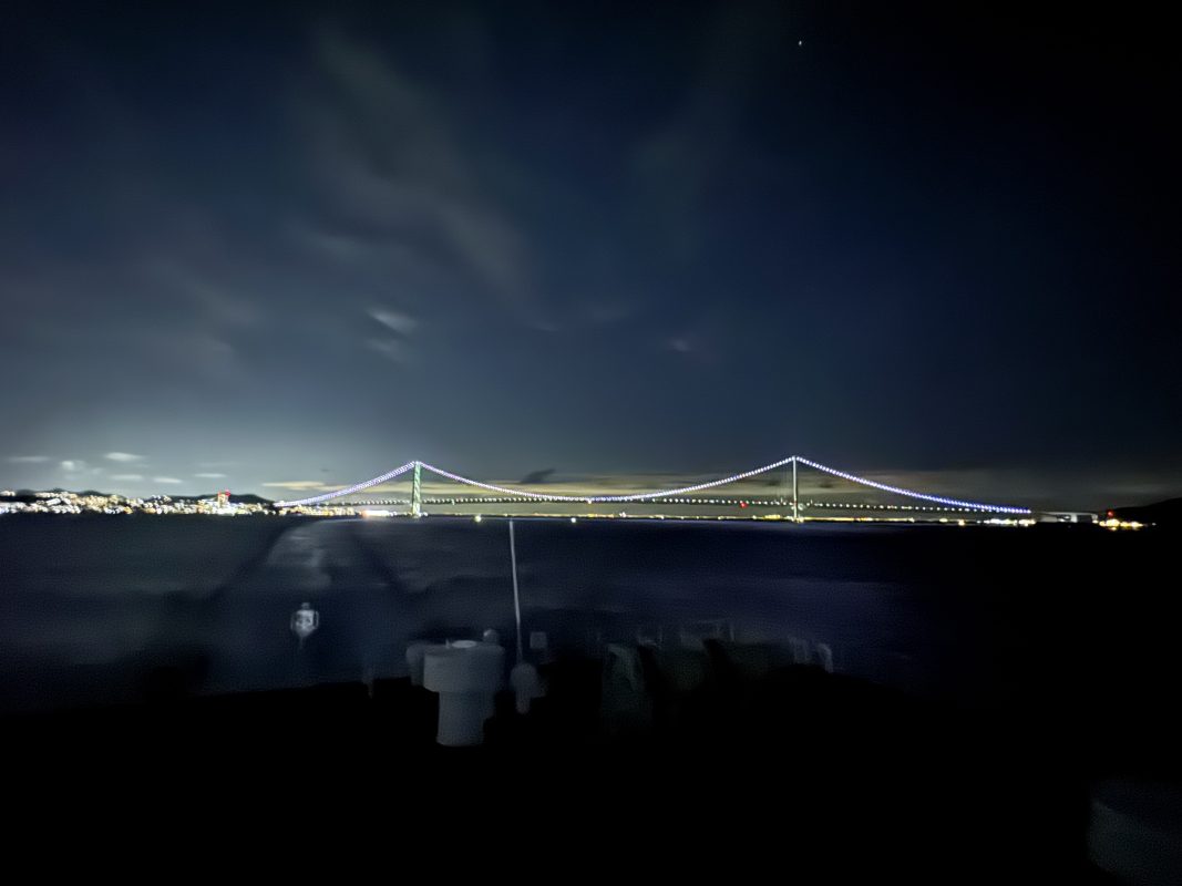 ライトアップされた瀬戸大橋も美しい。この景色が見れるのもフェリーの特権。
