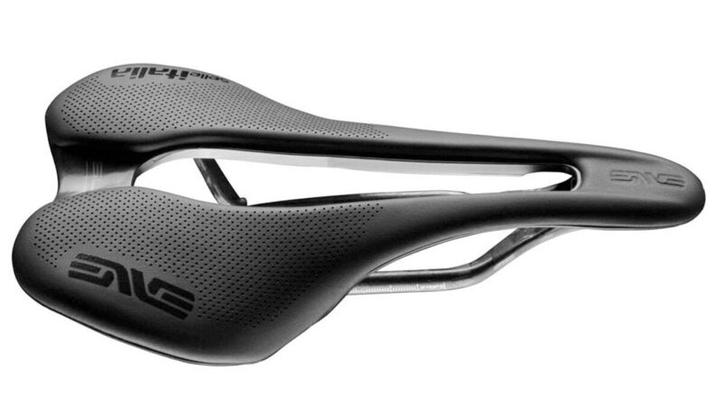 サドルの設計もベースの上にクッションを接着することで裏面まで引っ張る必要がなくなりアッパーにはクッション性を維持できるsoft-tekを採用。先端とサイドに配置されたENVEロゴが配置されています。