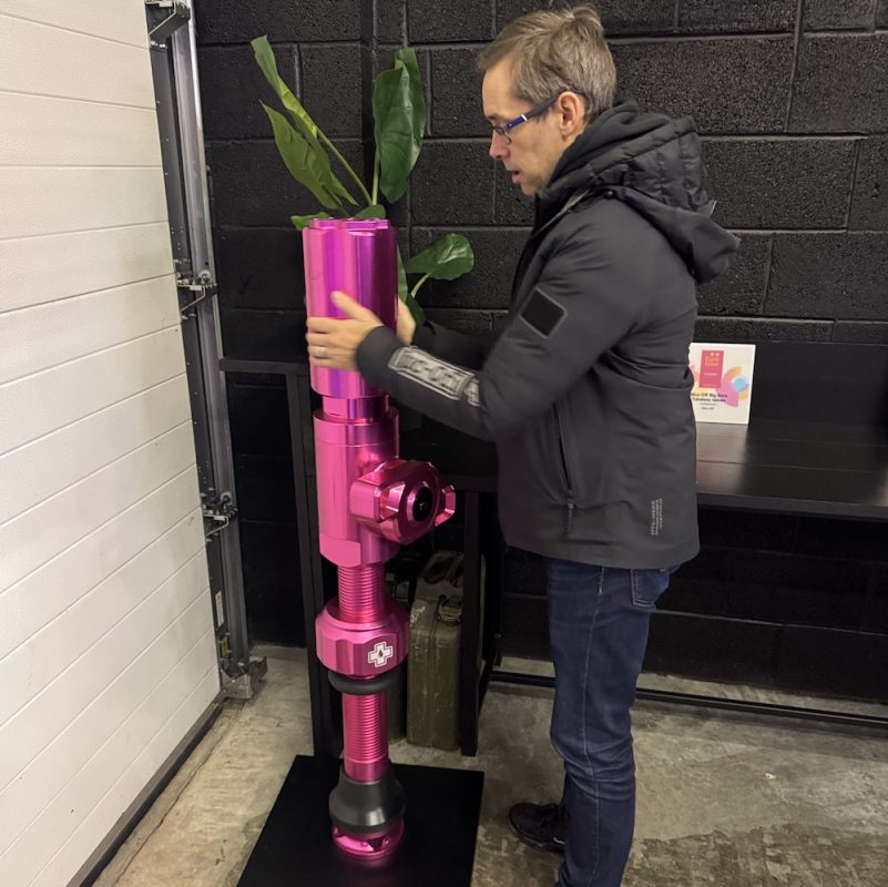 セールスディレクターのTimさんと並べるとわかるのですが、とにかくデカすぎる、BIG BORE VALVE HYBRIDの巨大オブジェです。